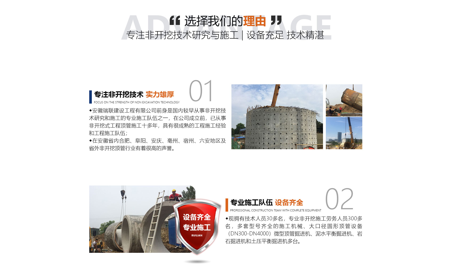 安徽瑞聯(lián)建設工程有限公司前身是國內較早從事非開挖技術研究和施工的施工隊伍之一,在公司成立前,已從事非開挖式工程頂管施工十多年,具有很成熟的工程施工經驗和工程施工隊伍,在安徽省內合肥、阜陽、安慶、亳州、宿州、六安地區(qū)及省外非開挖頂管行業(yè)有著很高的聲譽。面對日益擴大的市場,公司于2014年正式成立,公司擁有勞務分包及市政公用工程總承包資質。公司優(yōu)勢(文字):現(xiàn)擁有中高技術人員30多名,非開挖施工勞務人員300...